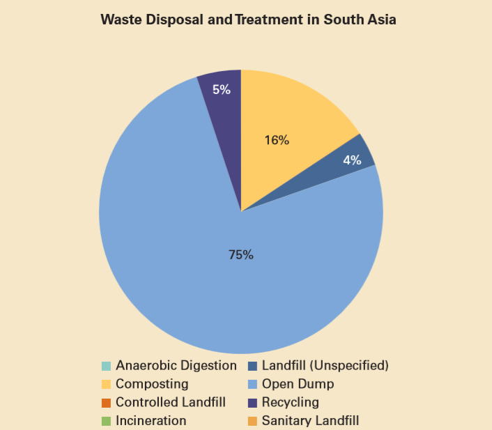 The South Asia region, where India is the largest country, generated 334 million tonnes of waste in 2016, at an average of 0 .52 kilogram per capita daily, with 57% characterized as food and green waste. About 44% of waste is collected in South Asia, mainly through door-to-door systems, and three-fourths of waste is currently openly dumped, although improvements to collection systems and construction of sanitary final disposal sites are underway.