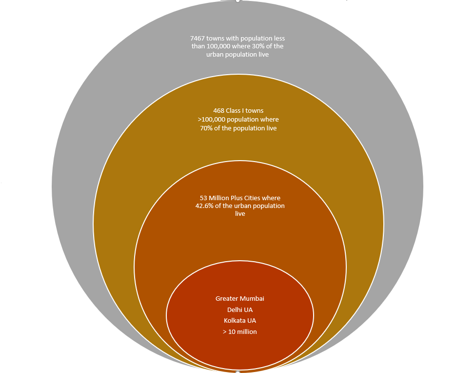 Now, 70 years after Independence, we find that India still lives in its villages (as Mahatma Gandhi famously said) with only 31% urbanization reported in Census 2011. As the figures below indicate, even this low urbanization is greatly skewed towards the larger metros with smaller towns only fit as launching pads for new migrants to the big bad city, because their local economies are virtually non-existent and can create no jobs, nor build careers. This skewness is largely a result of the Indian penchant for top-down, low-form urban planning, learnt from the British, who hankered after their own ‘green and pleasant land’, and rather unrealistically, tried to recreate it in the teeming tropics!