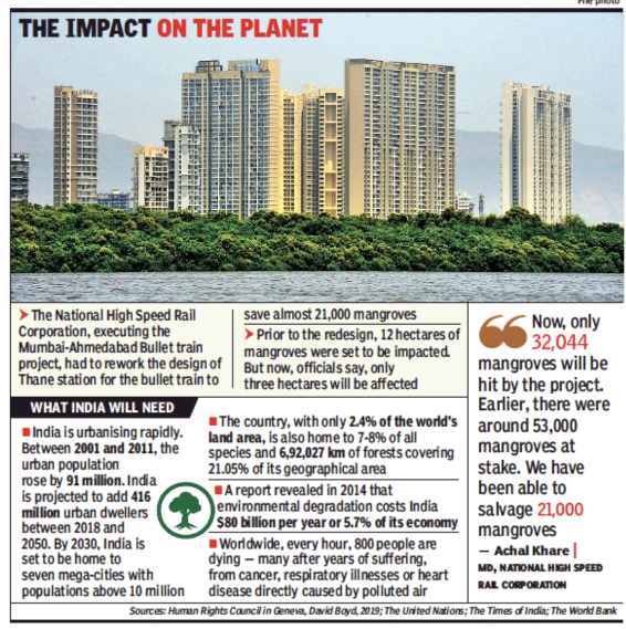- Secondly, if a government is obsessed with creating just infrastructure, there is always a tendency to bend the environmental guidelines to expedite land acquisition for projects, with disastrous consequences for the biodiversity and natural safeguards of the project area. The draining of the mangrove swamps of Kurla for the Bandra-Kurla Complex is now accepted as the primary cause for the repeated monsoon flooding of Mumbai, and something similar has happened to Nagpur with the unnecessary concreting of all its roads. It is axiomatic that the number of vehicles in a city will rise as the road network of a city expands, and it is the unprecedented growth of roads and fly-overs which has added to Delhi’s breathing problems.